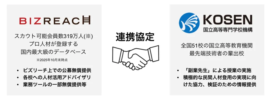 この取り組みの大きな特徴は、全国の高等専門学校において地域格差なく高品質な教育を提供できる仕組みです。ビズリーチは、即戦力人材と企業を結びつけるため、特に「副業・兼業」「オンライン授業可」を前提とした公募を実施し、高専の教室に民間プロ人材を招致しています。これにより、毎年約1万人の学生が最新のデジタル技術を学ぶ機会を得ることができ、即戦力として産業界に羽ばたいています。