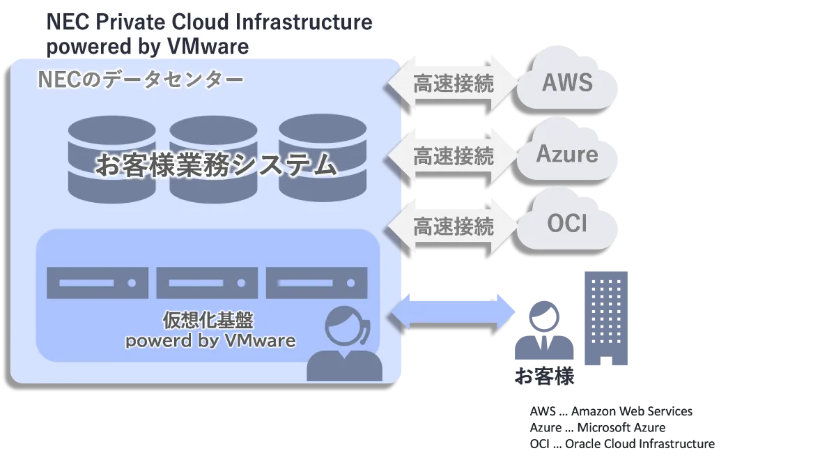 NECが新たに提供を開始した「NEC Private Cloud Infrastructure powered by VMware」は、最新のVMware Cloud Foundation (VCF)を基盤とするプライベートクラウド環境です。このサービスは、企業がデータ主権を保持しながら、高度なIT環境を実現することを目的としています。近年、データのセキュリティ意識が高まる中、プライベートクラウドが再び脚光を浴びており、パブリッククラウドと組み合わせたハイブリッド型の利用が増えてきています。これに伴い、IT人材の不足や複雑化するライフサイクルの管理に関するニーズも高まりつつあります。