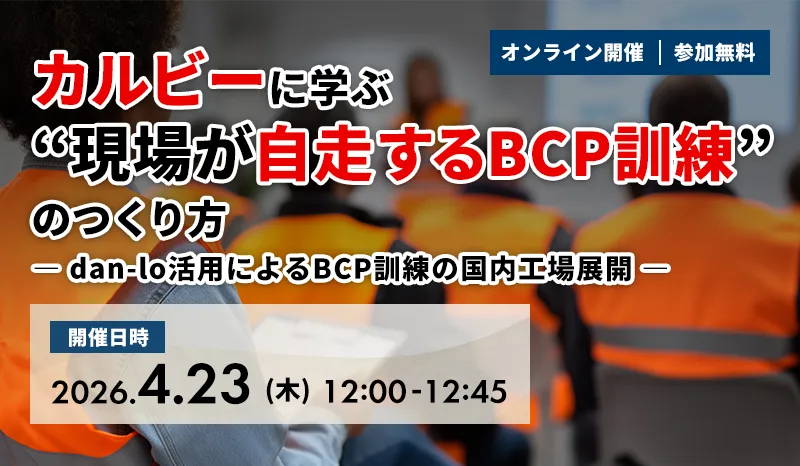 ニュートン・コンサルティング株式会社は、2026年4月23日(木)に「現場が自走するBCP訓練のつくり方」と題した無料のオンラインセミナーを開催します。本セミナーでは、全国に展開するカルビー株式会社のBCP訓練の実践事例をもとに、同社の担当者と当社のエグゼクティブコンサルタントによる対談を通じて、その取り組みのポイントや工夫について詳しく紹介します。