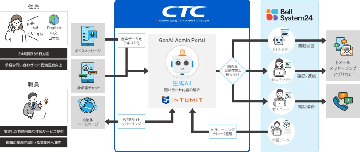 本サービスでは、HTMでの業務提携を通じて、250以上の地方自治体への実績を持つベルシステム24の専門知識を活用し、AI基盤の向上を目指しています。具体的には、AIによる自動応答から得られた回答を有人対応にフィードバックし、質の高いナレッジを蓄積することで、さらに精度を高めていきます。
