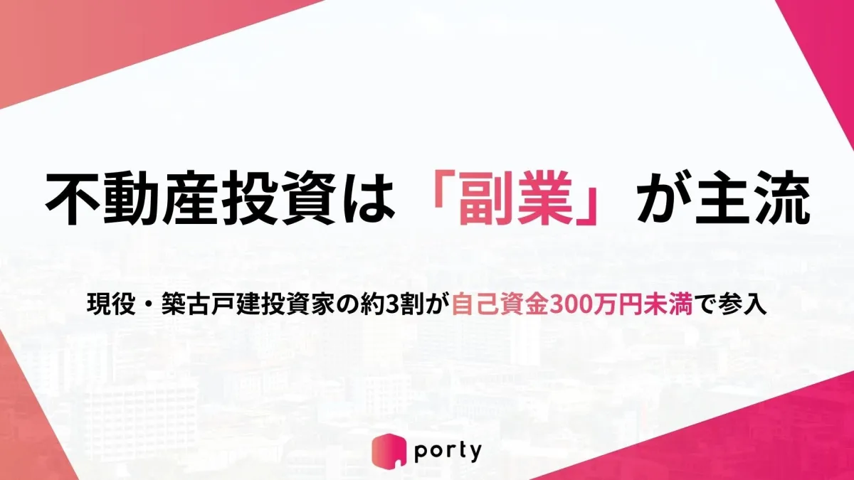 ポルティは、どんな家でも売買できるフリマアプリ「ポルティ空き家バンク」を運営しており、空き家の有効活用を目指しています。その一環として、築古戸建投資家の実態を明らかにするための調査を実施しました。この調査を通じて、不動産投資がどのように広がっているのか、特に副業としての位置付けや参入資金の状況を把握することが目的です。