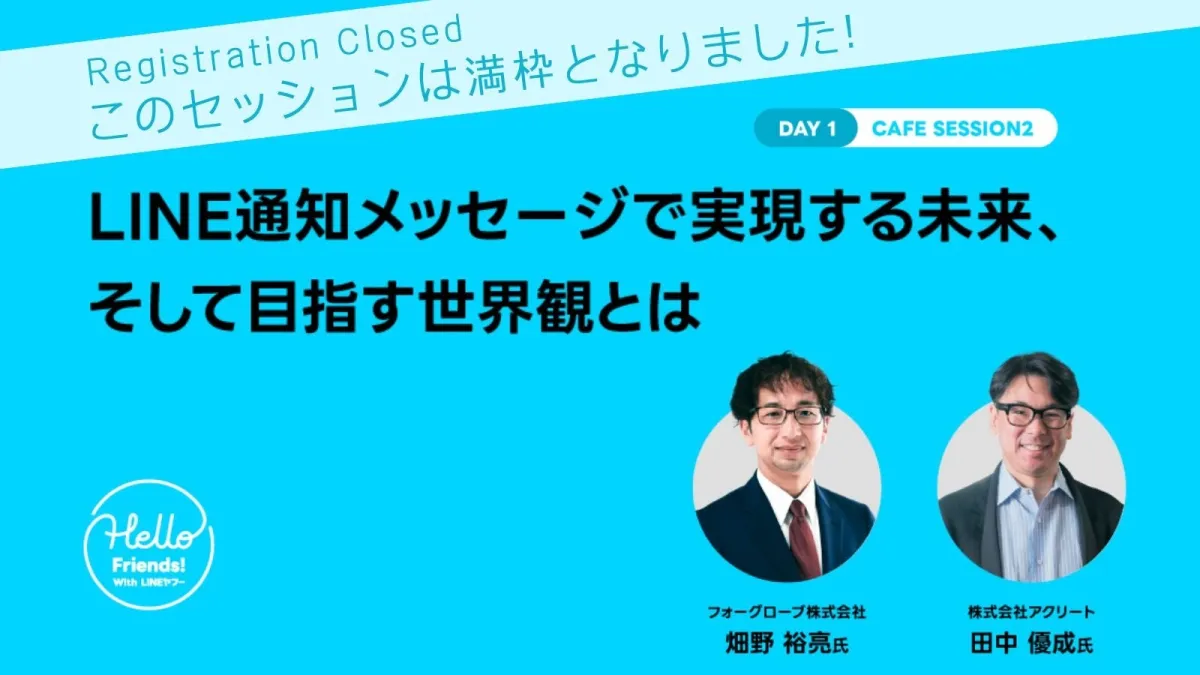 5月20日(火)の13:20から13:40まで、六本木ヒルズ内のヒルズカフェにおいて、フォーグローブの代表取締役社長・畑野裕亮が貴重なトークセッションを行います。今回のセッションには、株式会社アクリートの副社長・田中優成様をゲストにお迎えし、SMSとLINEの通知メッセージの現状と今後の展望についてディスカッションします。このセッションは既に定員に達していますが、業界の最新の動向を知る貴重な機会となるでしょう。