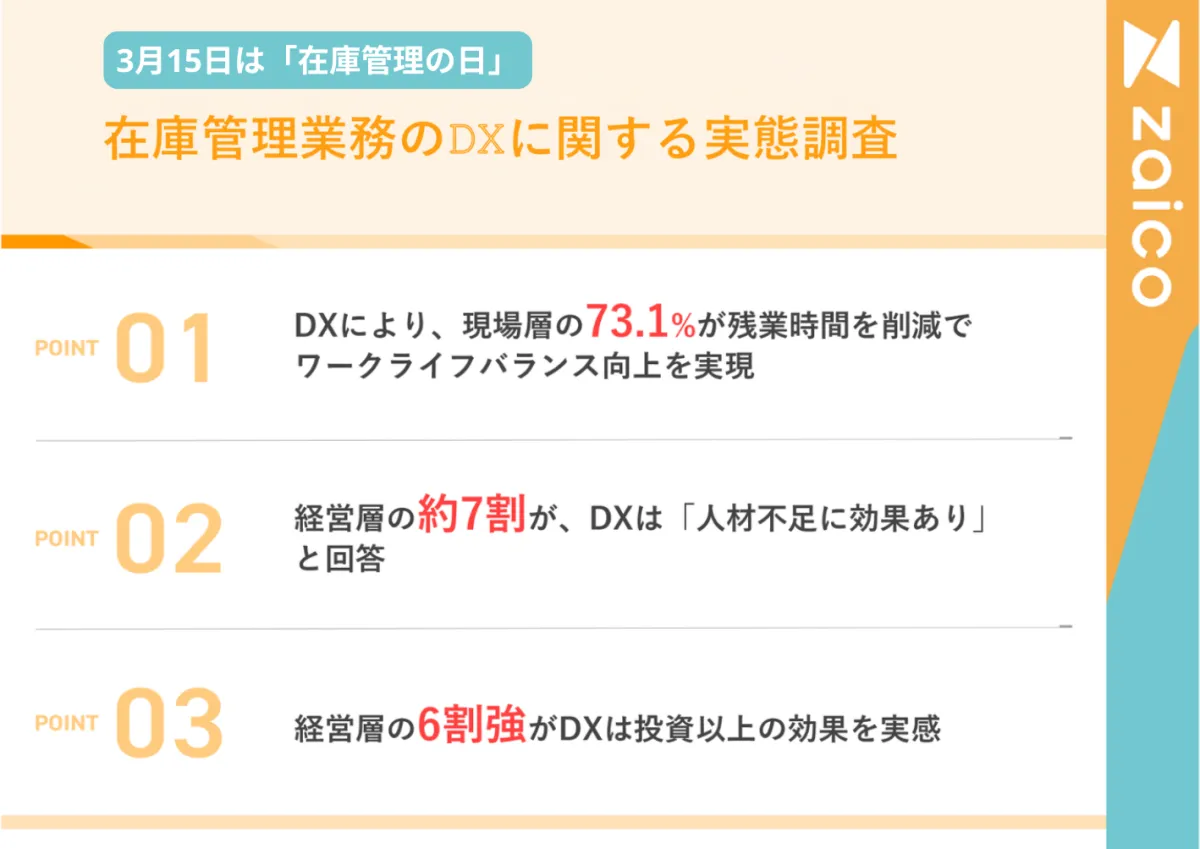 経営層からの意見も重要です。約70%の経営者が、DXが人材不足に対して効果を発揮していると感じています。この意見は、在庫管理の業務が属人化を解消し、部門間の連携を促進する結果に繋がっています。また、デジタル化による業務の効率化とそれによるコスト削減も経営者たちに歓迎されています。