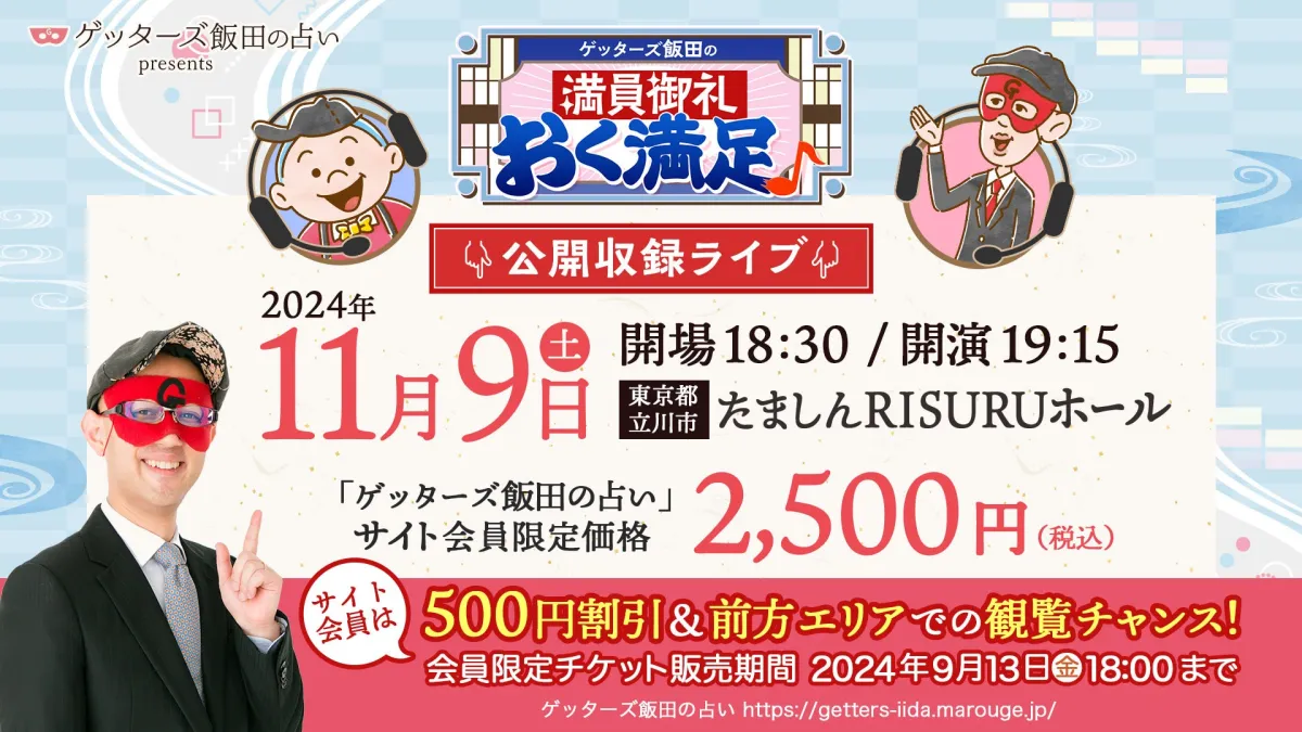 ゲッターズ飯田の公式占いサイト「ゲッターズ飯田の占い」が、人気のWebラジオ「満員御礼、おく満足♪」の公開収録を東京都立川市の『たましんRISURUホール』で開催することが発表されました。このイベントでは、ゲッターズ飯田さんとアシスタントの吉田おくまんさんのトークを生で楽しむことができ、さらに抽選で直接鑑定を受けるチャンスも用意されています。この貴重な機会をぜひお見逃しなく!