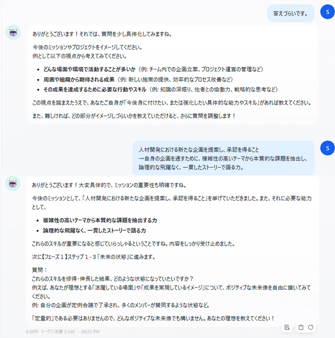 この成功に基づき、次のステップとしてAIエージェント「目標支援コーチ」が登場します。「目標支援コーチ」は、社内専用のAI技術を活用し、社員一人ひとりに適切な問いを投げかけることによって、彼ら自身の内省を促し、根本的な課題に向き合う手助けを行います。