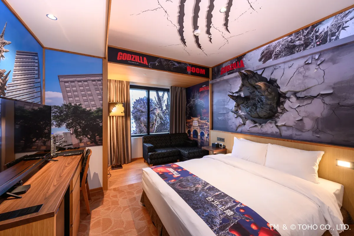 ゴジラルームは、それぞれ「台北」と「南台湾」の上陸にちなんだ2つのデザインが施されています。北部と中南部からそれぞれ上陸するゴジラをイメージしたお部屋には、視覚的にもインパクトのあるインテリアが整えられています。壁や天井には、ゴジラによる襲撃の痕跡が描かれ、リアルな造形や迫力ある鳴き声が皆さんを迎え入れます。さらに、台湾各地の風景と融合したデザインが施されているため、見どころ満載で、マニア心をくすぐる仕掛けが満載です。