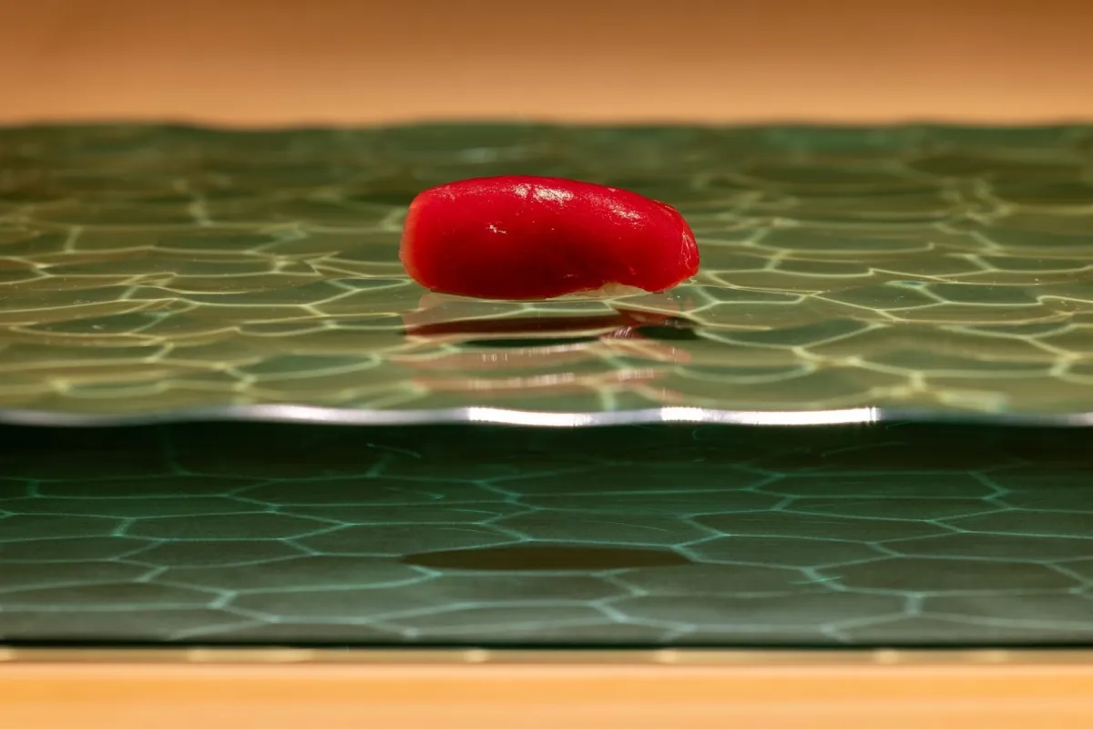 ここでの特徴的な点として、水の流れをイメージしたガラスの付台が挙げられます。客人が座るカウンター前の付台は、まるでお寿司が小川を泳いでいるかのように美しくプレゼンテーションされています。この工夫により、「食事としての体験」を最大限に楽しんでもらえるようになっています。