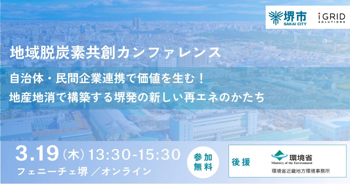 2026年3月19日、堺市との共催による「地域脱炭素共創カンファレンス」が行われます。主催は株式会社アイ・グリッド・ソリューションズで、参加者には堺市や環境省、地元企業が含まれ、地域における再生可能エネルギーの導入について具体的な議論が行われます。このカンファレンスは、2050年に目指す脱炭素社会の実現に向けた重要な場となります。