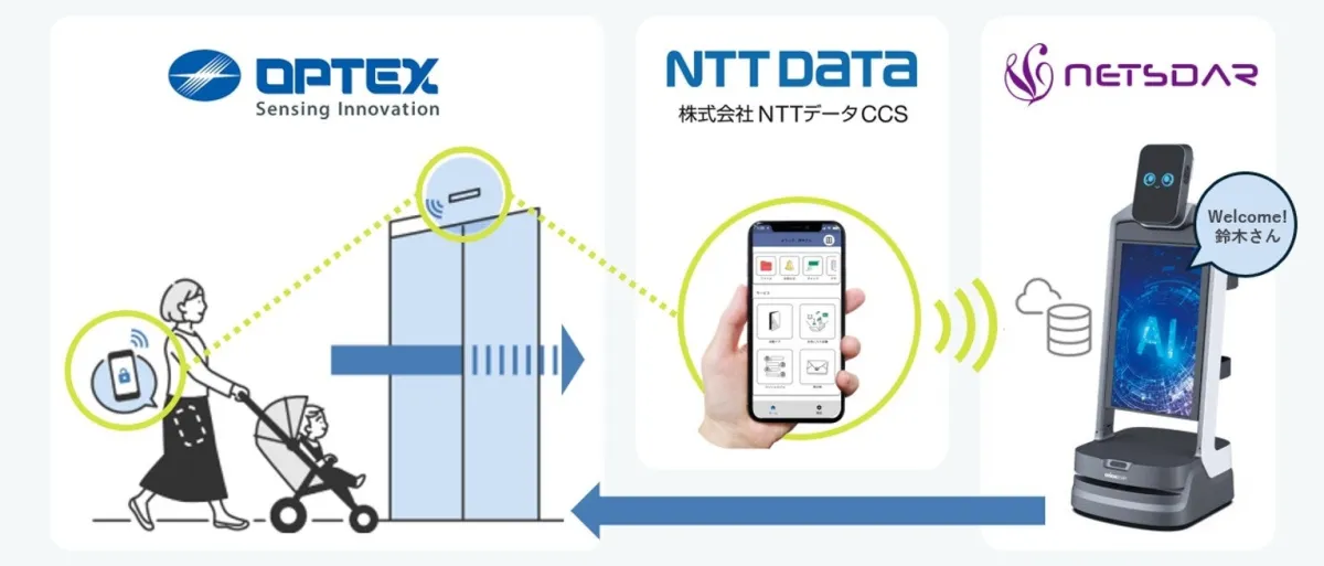オプテックスは、自動ドアセンサーソリューション「OMNICITY®」を提供します。この技術は、Beacon機能を盛り込み、スマートフォンとの通信を可能にしています。また、NTTデータCCSは、ポータルアプリを開発し、オプテックスの技術と連携させることでハンズフリーでのエントランス解錠を実現しています。さらに、ネットスターのロボットクラウドサービス「All in One DiRoboCS™」も統合することで、省人化を推進しつつ、顧客体験の向上が狙いです。