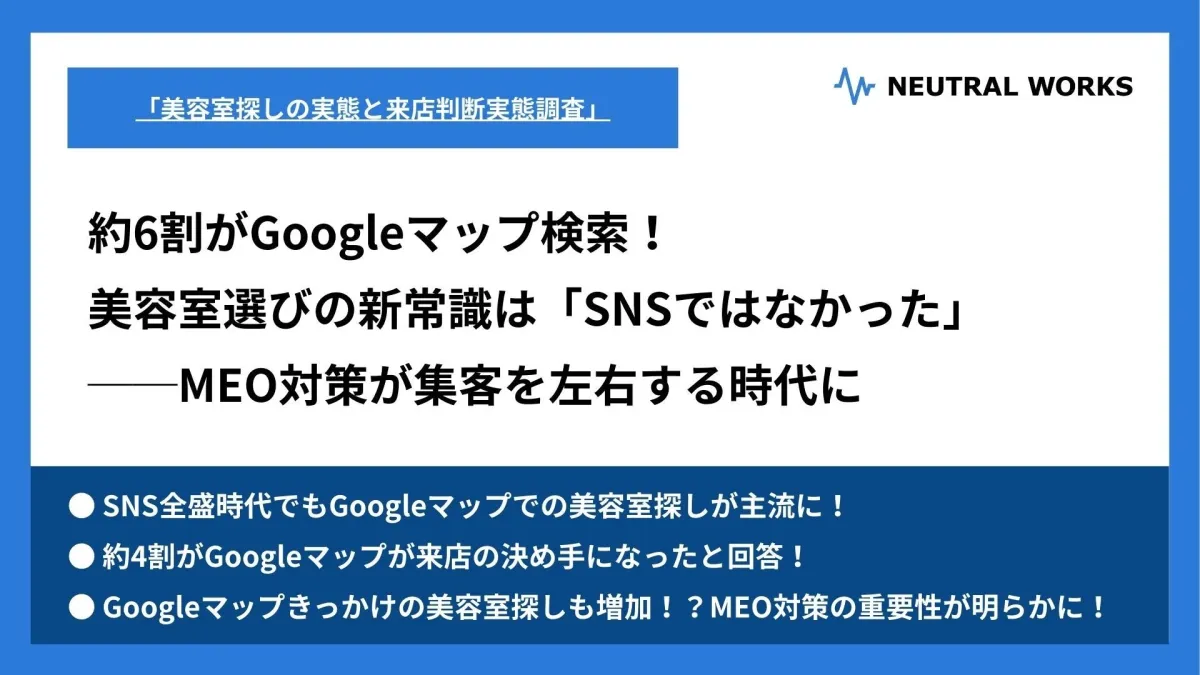 株式会社ニュートラルワークスが実施した調査によれば、美容室を日常的に利用している520名の男女のうち、約60%が美容室を見つけるのにGoogleマップを利用した経験があると回答しました。これは、魅力的な写真や口コミ情報を載せたSNSとは異なり、実用性やアクセス情報を重視する傾向が影響しています。