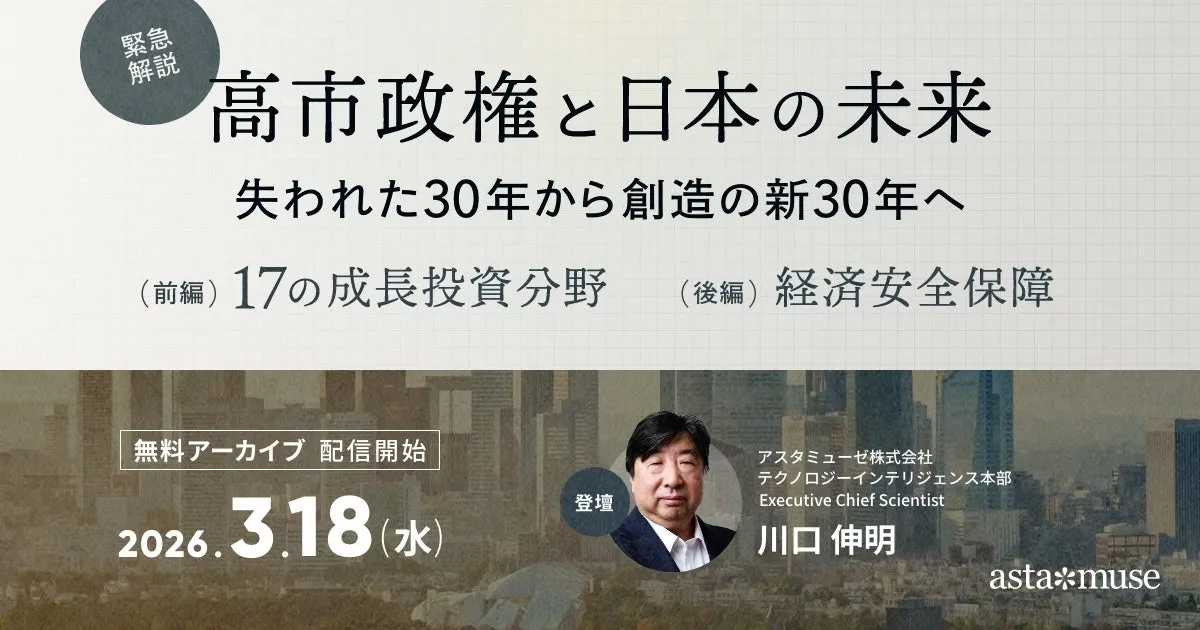 アスタミューゼ株式会社が2026年2月に実施したウェビナー『高市政権と日本の未来』が、2026年3月18日からアーカイブ配信されることとなりました。このウェビナーでは「17の成長投資分野」と「経済安全保障」というテーマについて、同社のExecutive Chief Scientistである川口伸明が詳しく解説しています。