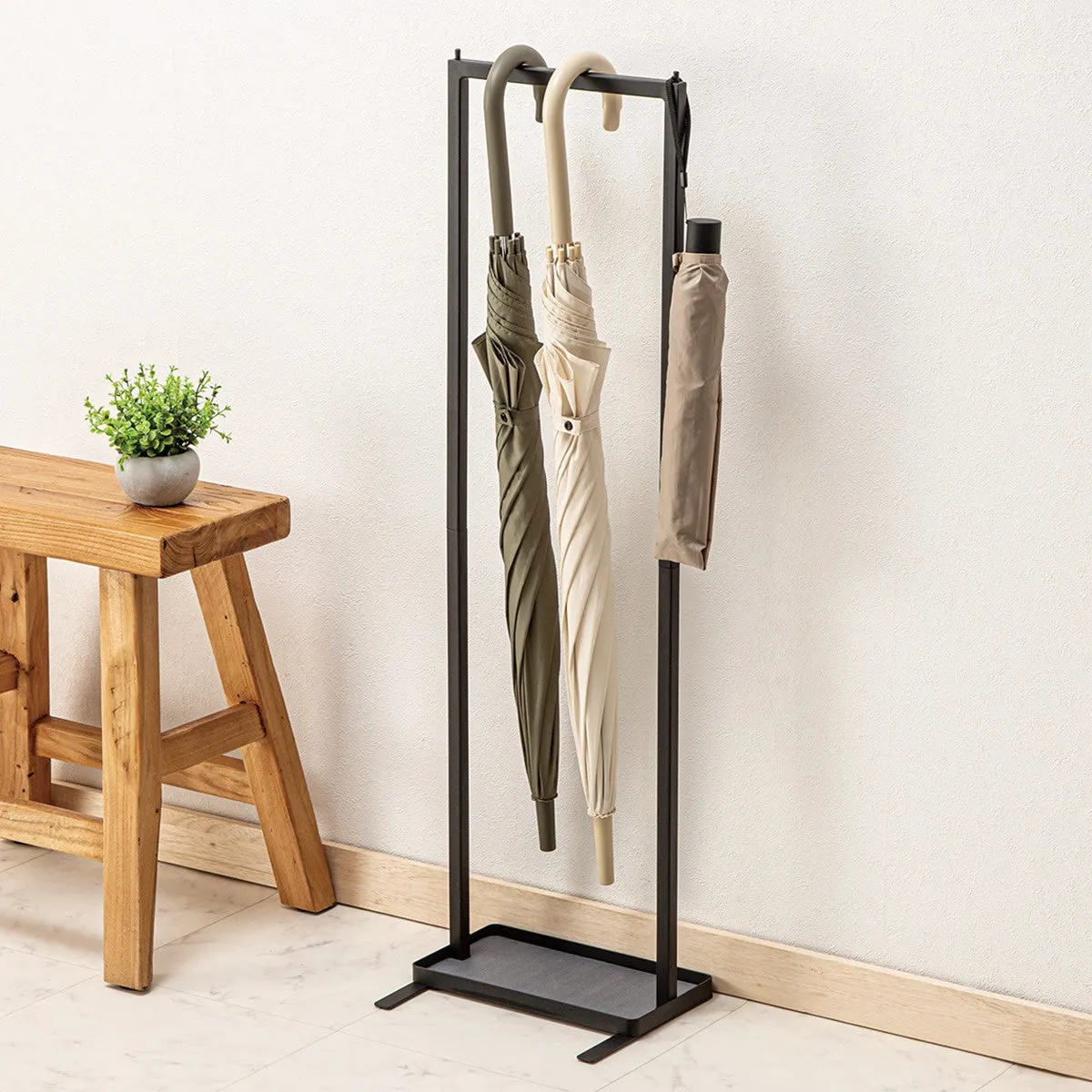 傘ハンガーの下部には、重心がしっかりとしたトレイが設けられています。このため、見た目以上に安定感があり、転倒の心配も少なく、日常使いに安心です。