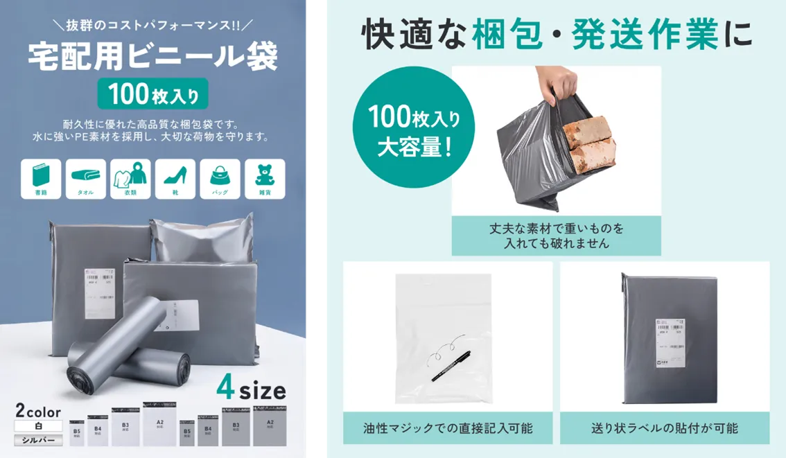 梱包に使用されるポリエチレン素材は、様々な配送条件に耐える強度を誇ります。これにより、配送中に商品が水や衝撃からしっかりと保護され、顧客に届く際の品質が確保されます。サイズ展開も豊富で、B5からA2相当のサイズまであり、幅広いニーズに応えることが可能です。