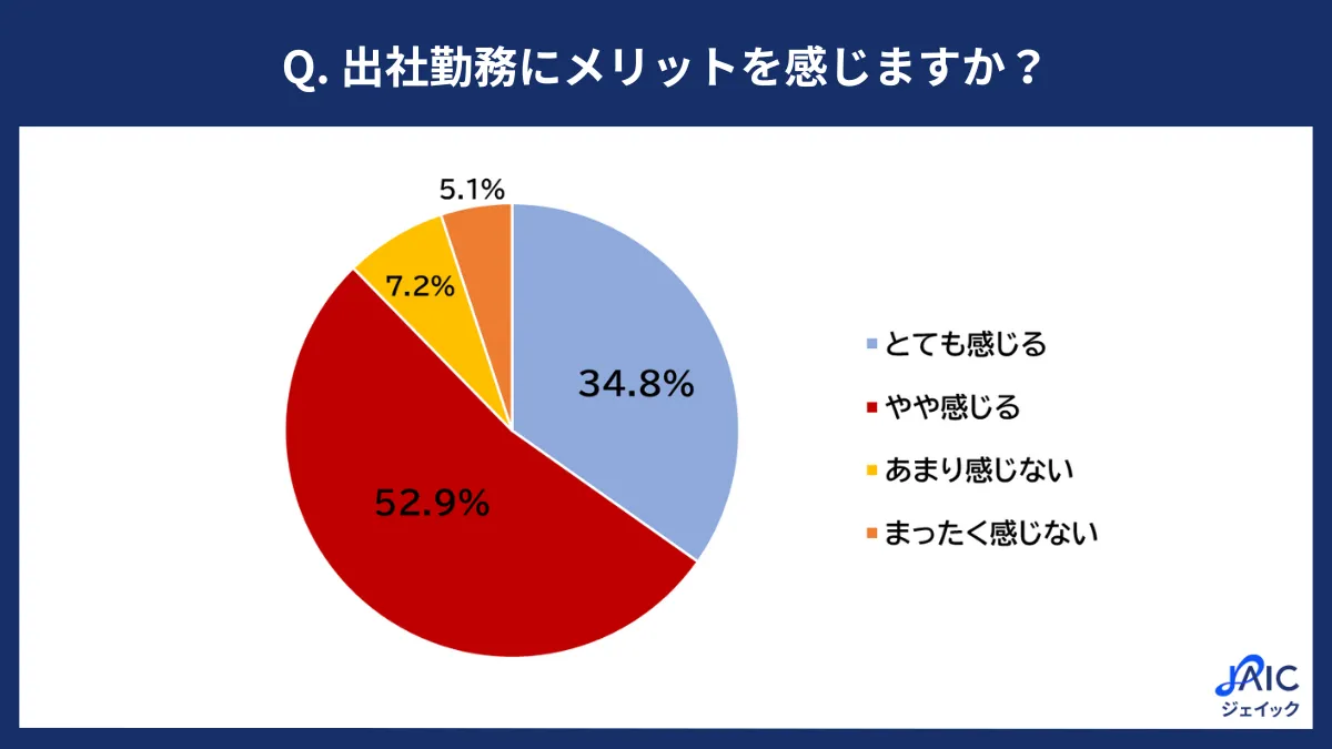 アンケートにおいて、「出社勤務にメリットを感じますか」という質問に対して、34.8%の回答者が「とても感じる」、52.9%が「やや感じる」と回答しました。つまり、出社勤務に対して感じているメリットの多さが伺えます。