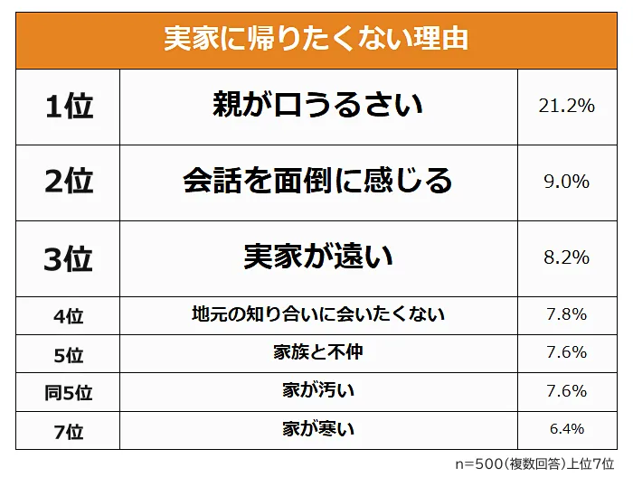 実家に帰りたくないという感情を抱く人々。今回は、株式会社ビズヒッツが実施した男女500人を対象とした意識調査から、その回答をランキング形式でご紹介します。