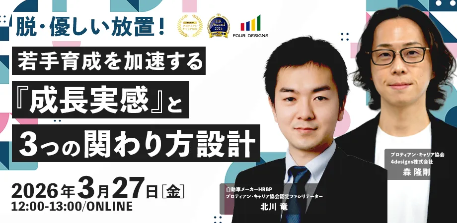 一般社団法人プロティアン・キャリア協会が主催するオンラインセミナーが、2026年3月27日(金)12:00に開催されます。本セミナーは、若手育成をテーマに、彼らの主体性を高めるためのマネジメントについて学ぶ良い機会です。
