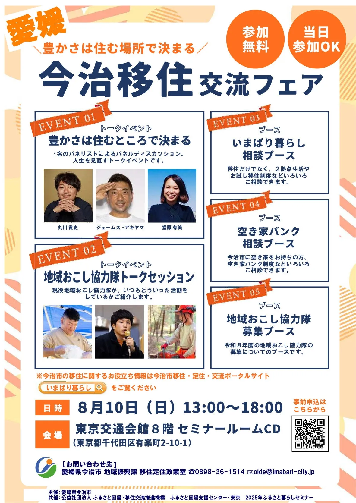 この交流フェアは、豊かな自然と人々が魅力の今治市の情報を直接得られる貴重な機会です。都会の喧騒を離れ、新しいライフスタイルを探るために、ぜひ参加してみてください。あなたの未来を変えるチャンスがここにあります。移住を考えるなら、今治市の移住交流フェアをお見逃しなく!