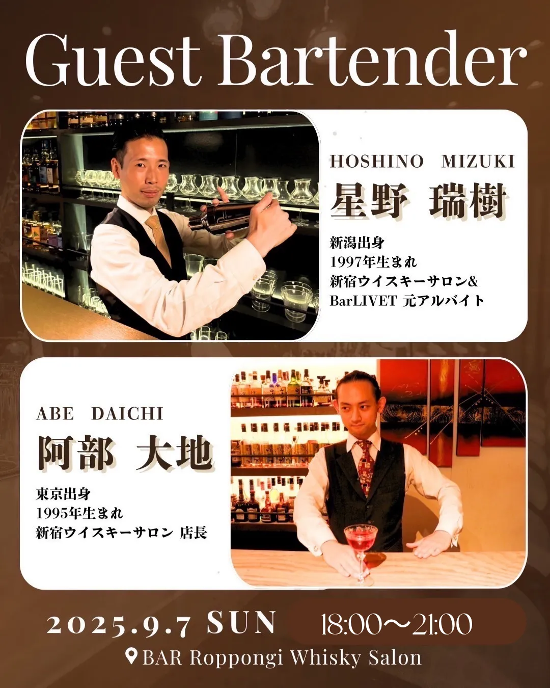 2025年9月7日、六本木ウイスキーサロンにて特別なイベントが開催されます。このイベントでは、星野瑞樹氏と阿部大地氏という2名のバーテンダーが、彼らの個性溢れるカクテルを披露します。ウイスキーサロンの世界観を心ゆくまで体験できるこの機会、ぜひお見逃しなく。