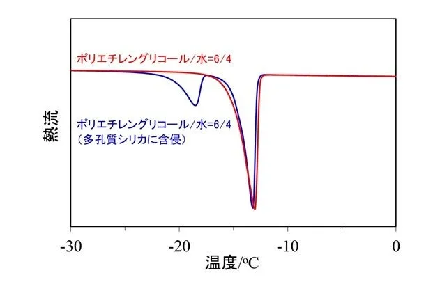 具体的には、細孔径が既知のシリカ多孔体にPEGの水溶液を含浸させ、示差走査熱量測定(DSC)を用い、融点を測定することで、PEGのナノ構造を評価します。結果、PEG水溶液に由来する二つの融点が観測され、これを利用することでナノスケールのPEGのドメインサイズを同定できることが明らかになりました。