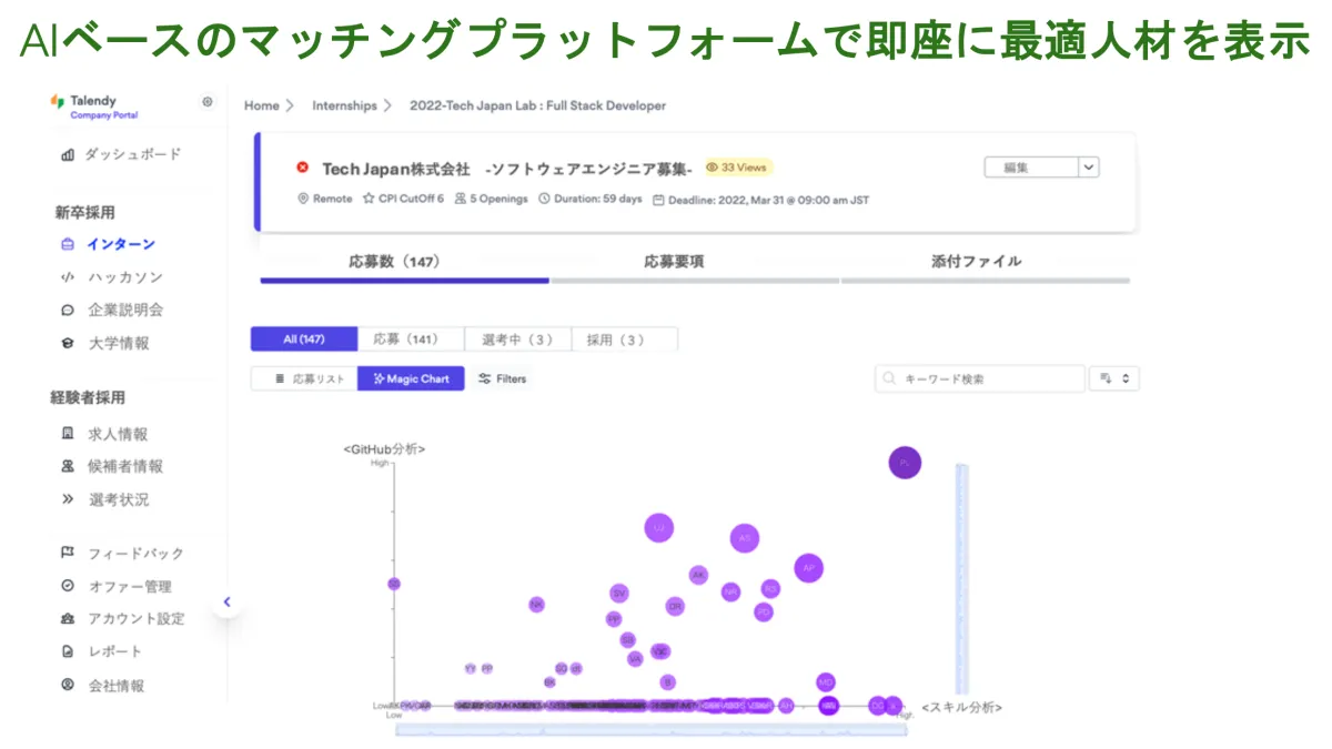 テクノロジー分野における高度なインド人材の採用支援を行うTech Japan株式会社(本社:東京都千代田区、代表取締役:西山直隆)が、自社のHRプラットフォームであるTalendyに新機能を追加したことを発表しました。その名も「Magic Chart」と「セルフラーニング機能」です。この機能により、企業はスキルや経歴をもとに最適な候補者を効率よく選別できるようになります。