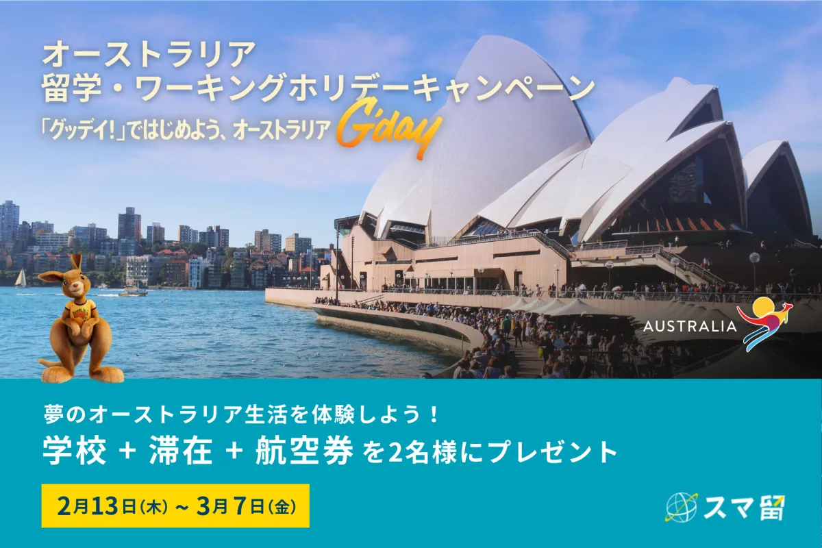 海外留学エージェント『スマ留』を運営する株式会社リアブロードは、オーストラリア政府観光局と共に特別な「留学・ワーキングホリデーキャンペーン」を発表しました。これは期間限定で、スマ留の無料カウンセリングに参加された方の中から抽選で、2名に海外留学またはワーキングホリデーの1ヶ月分がプレゼントされるというものです。この機会に、オーストラリアでの新たな冒険を体験してみませんか?