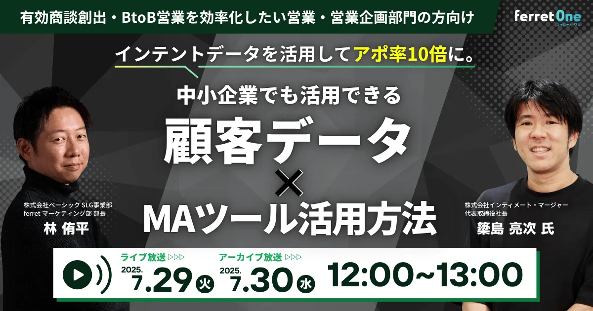 2025年7月29日火曜日の12時より、株式会社ベーシックが主催するオンラインセミナー「インテントデータを活用してアポ10倍に。中小企業でも活用できる顧客データ×MAツール活用方法」が開催されます。これは、特にBtoB企業の営業部門にとっての効率的な営業手法についての重要な情報が得られる機会です。