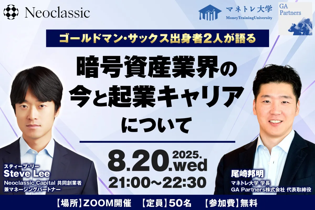 2025年8月20日、特別対談イベントが開催される。元ゴールドマン・サックスに所属していた二人の起業家、尾崎邦明氏とスティーブ・リー氏が、暗号資産業界の今と自身のキャリアについて語るこのイベントは、金融業界に興味がある多くの人々に新たな視点を提供するだろう。