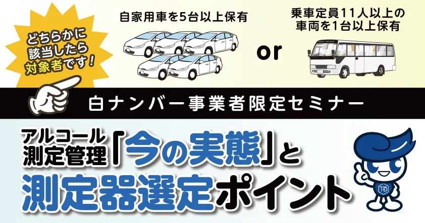 このセミナーでは、白ナンバー事業者におけるアルコール測定管理義務の現状について整理し、制度上の要点や現場での実態を把握するための情報を提供します。また、ALC-MobileⅢや白ナンバー向け安全運転管理システムを例に、運用負荷の観点からの測定器選定のポイントについても詳しく解説します。