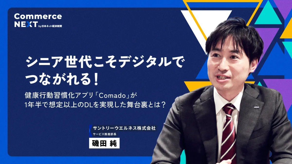 2023年6月26日、27日の2日間、株式会社日本流通産業新聞社が主催する初の大型オンラインセミナーイベント「Commerce NEXT」が開催されます。特に注目されるのは、サントリーウエルネスのサービス推進部長である磯田純氏が登壇する基調講演です。磯田氏が話すのは「シニア世代こそデジタルでつながれる!健康行動習慣化アプリ『Comado』が1年半で想定以上のDLを実現した舞台裏」と題した講演です。