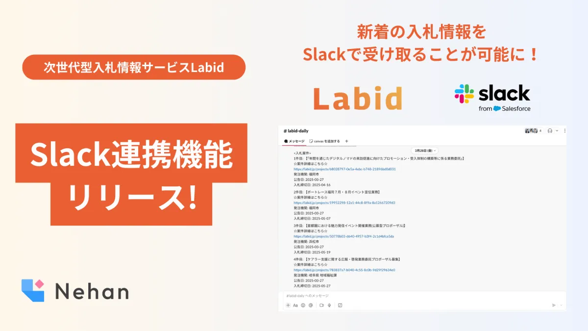 Nehan株式会社が提供する次世代型入札情報サービス『Labid』が、業務の効率化を図るべく新たにSlackとの連携機能を発表しました。この新機能により、新着の入札情報をメールではなくSlackで受け取ることが可能となります。