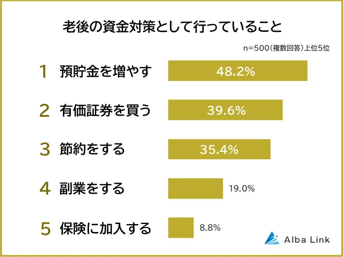 老後の資金対策として、最も多い回答は「預貯金を増やす」で48.2%がこの方法を実施しています。続いて「有価証券を購入する」と「節約をする」が39.6%、35.4%と、堅実なものがランクインしています。これに見られるのは、安定した資産運用を求める傾向です。