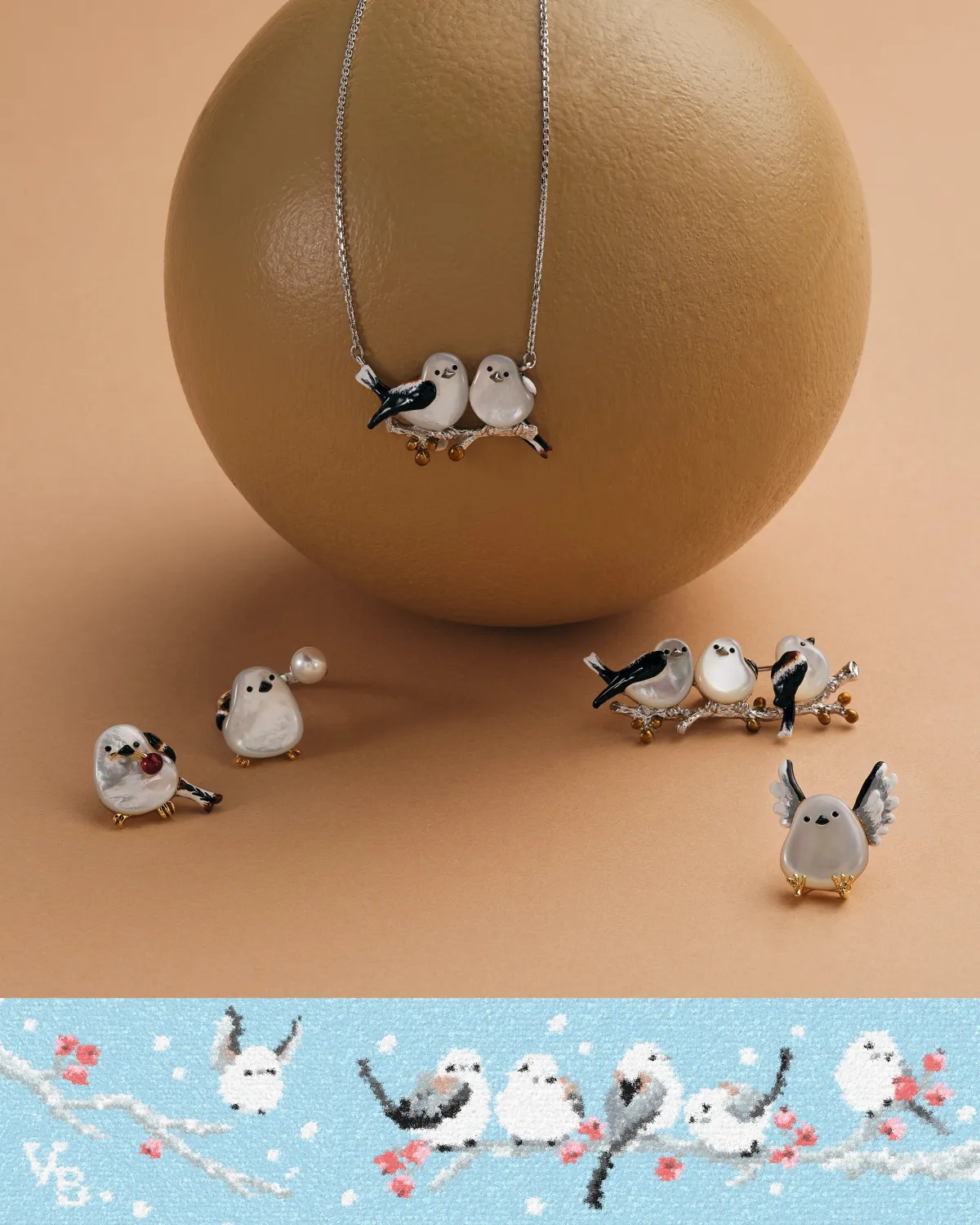 このコレクションは、シマエナガをモチーフにしたさまざまなアクセサリーと、それに合わせたフェイラー製ポーチのセットから構成されています。すべてのアイテムは、丸みのある白蝶貝を基にデザインされ、見る者の心を掴む温かみを感じさせます。また、熟練の職人が手作業で仕上げた尾羽や表情は、リアルさと可愛らしさを両立させています。