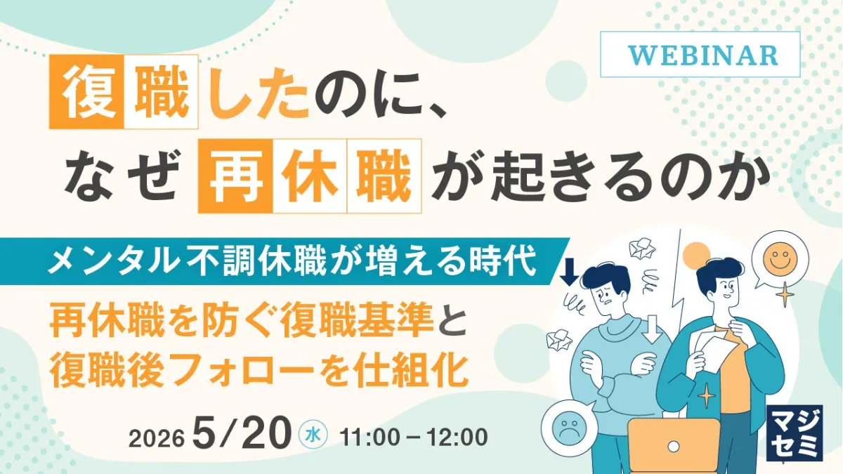 このような厳しい状況を改善するためには、メンタル不調に陥った社員が安定して復職できるような支援の仕組みを整えることが不可欠です。今般開催されるウェビナーでは、休職者の状況や企業が抱えるリスクを整理しつつ、復職支援を体系化するための考え方を詳しく解説します。