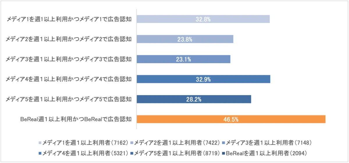 調査の結果、BeReal広告は他メディアに比べて約2倍の効果を持つことが明らかになりました。具体的には、BeRealでの広告認知率は46.5%に達し、主要なソーシャルメディアの中で最も高い結果を記録しました。この結果は、多くのユーザーがBeReal上の広告に対して高い関心を持ち、注意を払っていることを示しています。