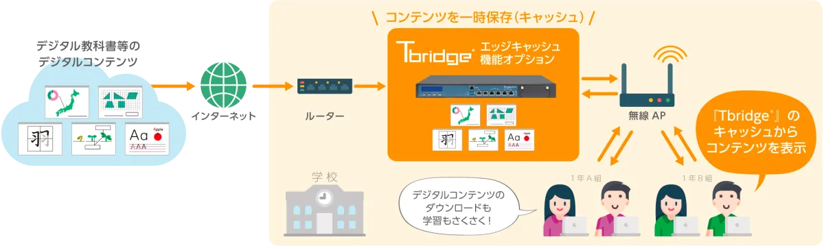 新たに追加されるエッジキャッシュ機能は、特にデジタル教科書やOSのアップデートなど、同じコンテンツを多くの生徒が利用する環境で効果を発揮します。この機能により、Tbridge®内にコンテンツを一時保存し、インターネットへの負荷を大幅に軽減します。すでに上位モデルの『Tbridge® 500』『Tbridge® 1000』において効果が確認されており、今回のエッジキャッシュ機能の追加で小規模校の利用も一層促進されることでしょう。
