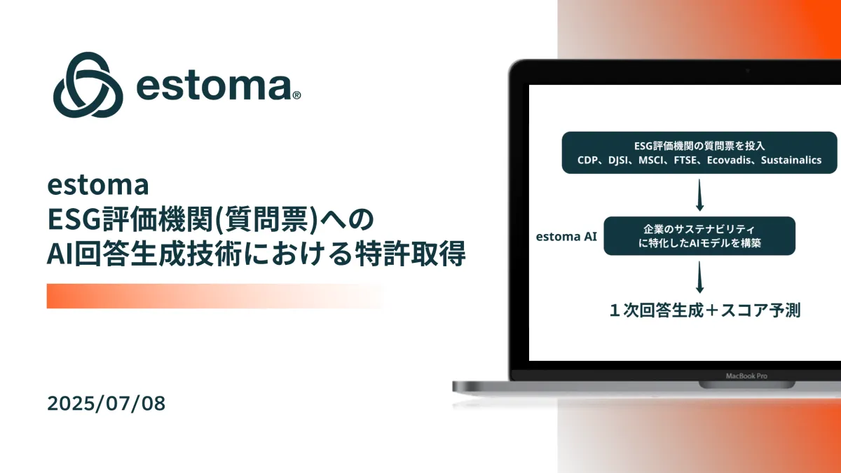 株式会社estomaは、ESG情報の開示支援を目的としたクラウドサービス「estoma」に搭載されたAIによるESG回答生成システムに関して特許を取得しました。この特許は、企業が直面するESG評価機関からの様々な質問に対し、過去のデータを参照して自動で回答を生成する技術に関するものです(特許公開番号:JP2025-39443)。