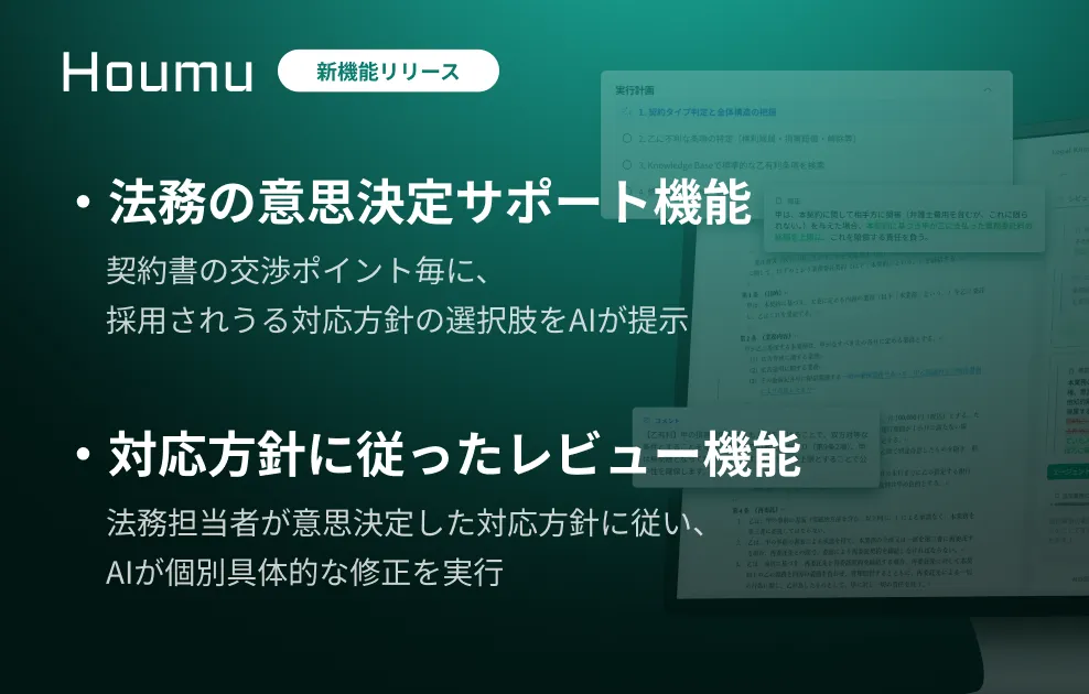 株式会社KenRiが展開する法務AIエージェント「Houmu」は、法務担当者の業務をこれまで以上に効率化する新機能を発表しました。これからのリーガルテックの進化を支える「法務の意思決定サポート機能」と「対応方針に従ったレビュー機能」の2つの新機能に焦点を当て、その内容を詳しく解説します。