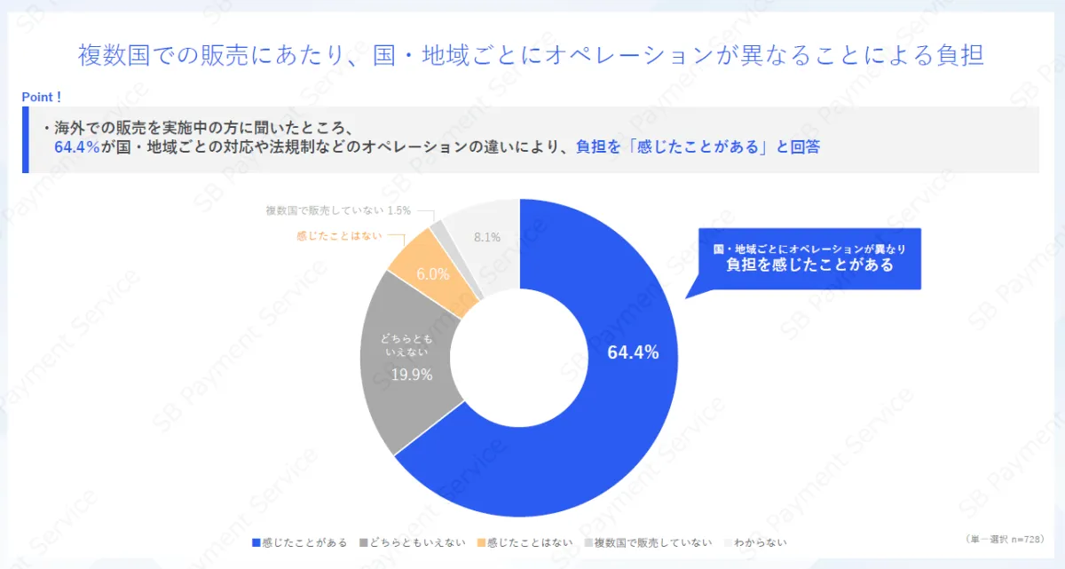 さらに、64.4%の企業が国や地域ごとのオペレーションの違いに負担を感じており、これは特に販売を実施中の企業において顕著です。「法規制・コンプライアンスへの対応」が33.8%と最も高い課題として浮かび上がりました。