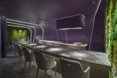 天井と壁はシームレスに繋がった7枚の紫色のスキンで覆われていて、幻想的に照らされることでまるで異次元に迷い込んだかのような体験を提供します。天井には小型のスポットライトが配置され、カウンター上の料理を美しく照らす工夫がされています。さらに、オープンキッチンが設けられ、シェフが料理を作る様子も楽しめます。この独自の空間デザインが、客の体験価値を高め、ビジネスとしての成果を生み出す要因とされています。