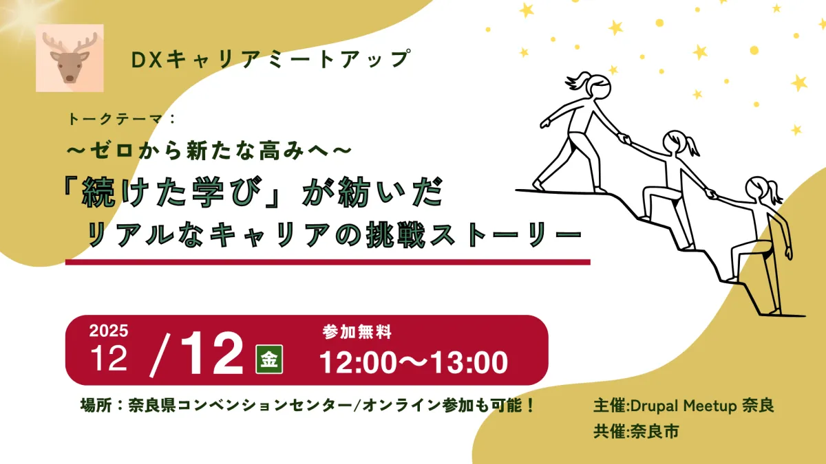 来たる2023年12月12日、奈良県コンベンションセンターにて、「〜ゼロから新たな高みへ -続けた学びが紡いだリアルなキャリアの挑戦ストーリー」がテーマのDrupalミートアップが行われます。このイベントは、今の時代に求められるライフスタイルや働き方の変化について考え、デジタルトランスフォーメーション(DX)への挑戦を志す方々が一堂に会し、情報を交換しながら相互学習を進める場となります。