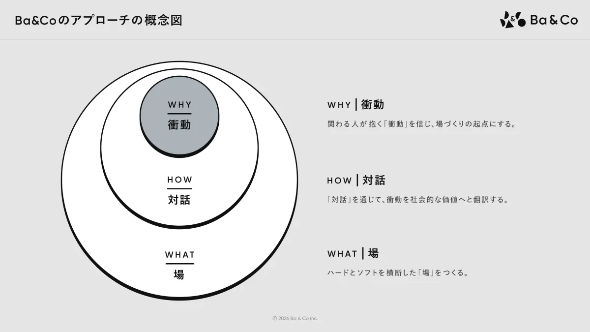 近年、AIなどの技術の進展により、想像力やアイデアを具体化しやすい環境が整いつつあります。しかし、場づくりの実現には、単なる空間の設計を越え、社会性や事業性、地域との関係性など多面的な視点が必要です。バ・アンド・コーは、こうしたニーズに応じて「studiosカンパニー」を設立し、これからの場づくりにおける役割を再定義します。