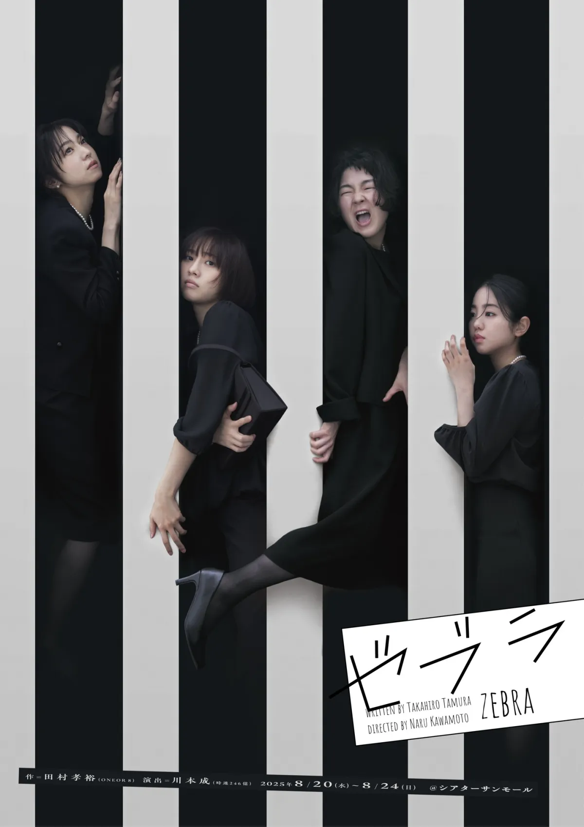 舞台『ゼブラ』が、2025年8月20日(水)から24日(日)まで東京のシアターサンモールで上演されることが発表されました。新たに公開されたメインビジュアルは、作品のテーマである家族の愛憎劇を強く印象づけるデザインとなっています。このビジュアルでは、鯨幕とゼブラ柄の壁を背景に、中村静香、木﨑ゆりあ、佐藤日向、ゆにばーすはらの4姉妹が描かれ、それぞれの思いや葛藤が浮き彫りになるような構図が工夫されています。