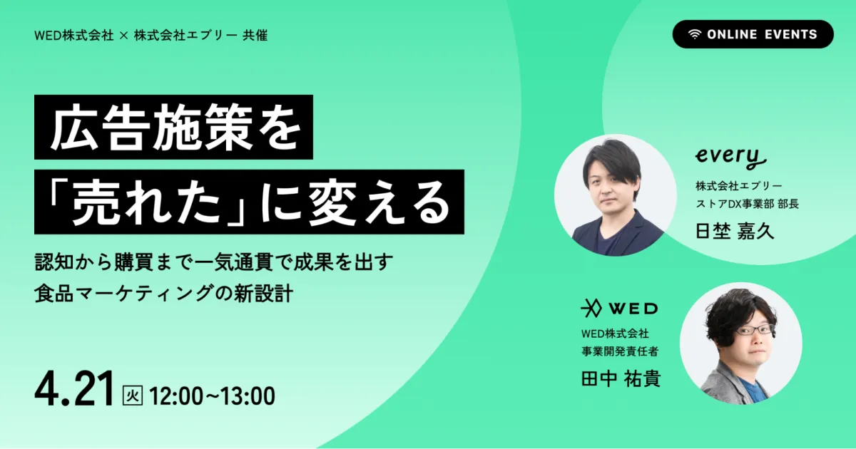 2026年4月21日(火)、WED株式会社と株式会社エブリーが運営する『デリッシュキッチン』は、食品・飲料メーカーのマーケティングや営業企画を担当する方々を対象としたオンラインウェビナーを開催します。このイベントは無料で参加可能で、Zoomを通じて約60分間行われます。