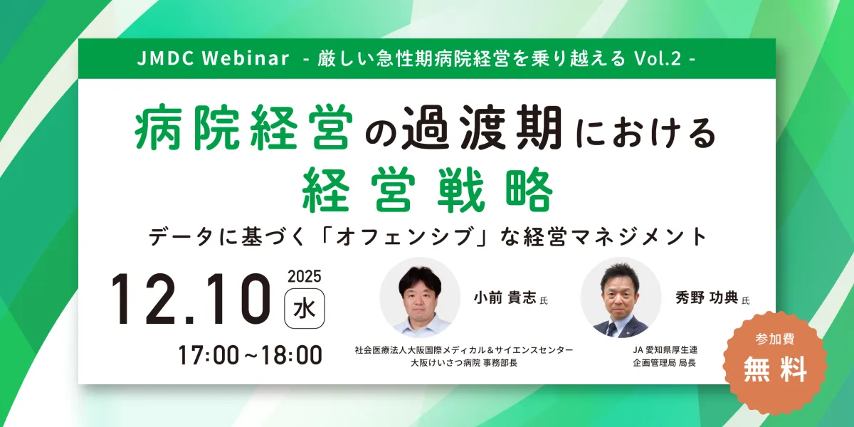 病院経営が困難な状況に直面している現在、医療機関の経営改善が急務となっています。株式会社JMDCが主催するオンラインセミナー「厳しい急性期病院経営を乗り越える Vol.2」は、2025年12月10日(水)に開催される予定です。このセミナーでは、データに基づいた「オフェンシブ」な経営マネジメントについて深く掘り下げていきます。