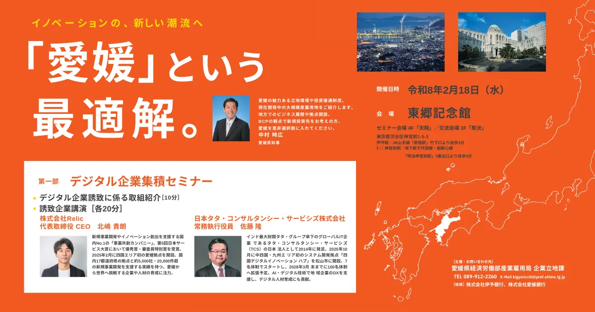 今後、2026年2月18日、水曜日に東京都心で開催される「えひめ産業立地ミーティング」にて、株式会社Relicの代表取締役CEOである北嶋貴朗氏が登壇することが発表されました。このイベントは、愛媛県への事業展開を考える首都圏の企業に向けて企画されており、実際に愛媛県に拠点を設立した企業の経営者が、その経験や実績を語る貴重な場となります。