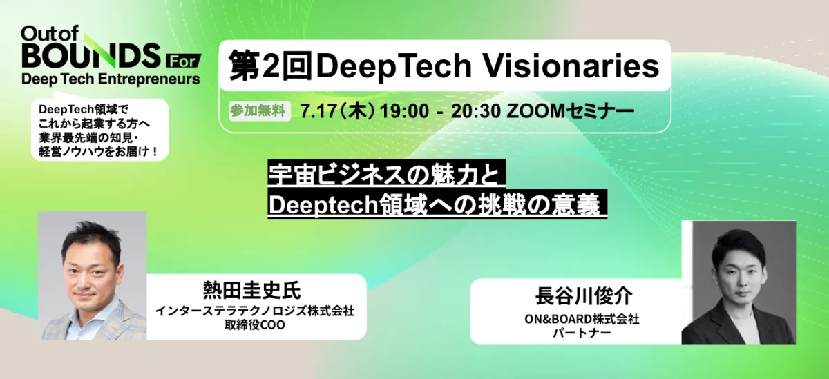 本プログラムには、定期的なオンラインセミナー「DeepTech Visionaries」が含まれ、国内外の著名な起業家や投資家を招いて、ゲストによるトークやパネルディスカッションが行われます。次回は、インターステラテクノロジズの取締役COO、熱田圭史氏を迎え、宇宙ビジネスとディープテックの融合について語っていただきます。