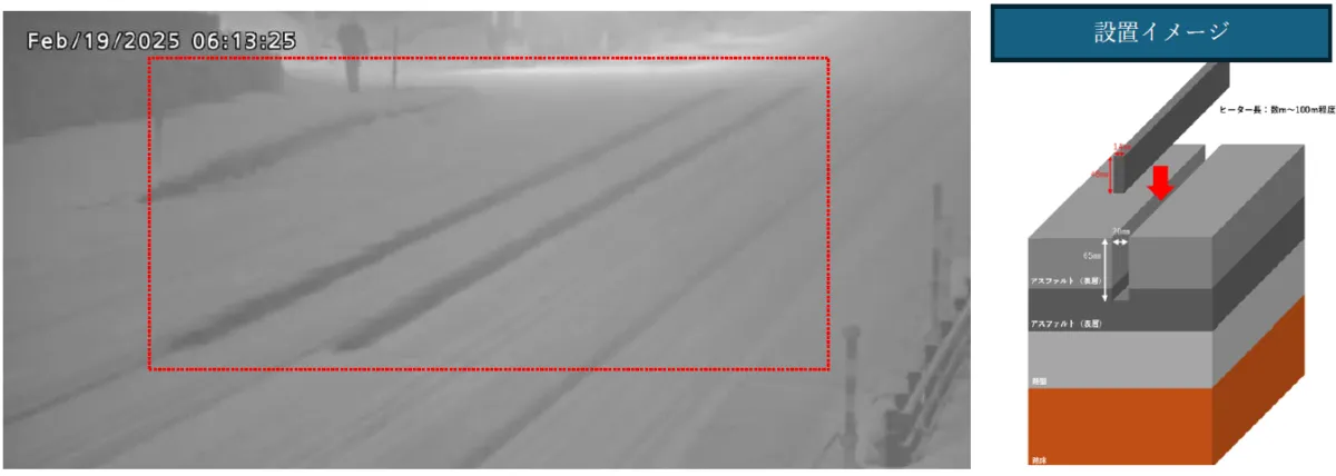 また、この技術は縦入れ工法を採用しているため、地震などの影響を受けにくく、昨年新潟県での導入時には能登地震の影響を受けることもありませんでした。さらに、短工期の商品であるため、民間企業の敷地内での施工も、土日などの休業日に行うことができる利便性もあります。氷や雪を融かす効果は、溝の中心から15~20センチ程度に及び、その後の融雪水が周囲の雪を溶かすことで、さらに融雪の範囲を拡大していきます。
