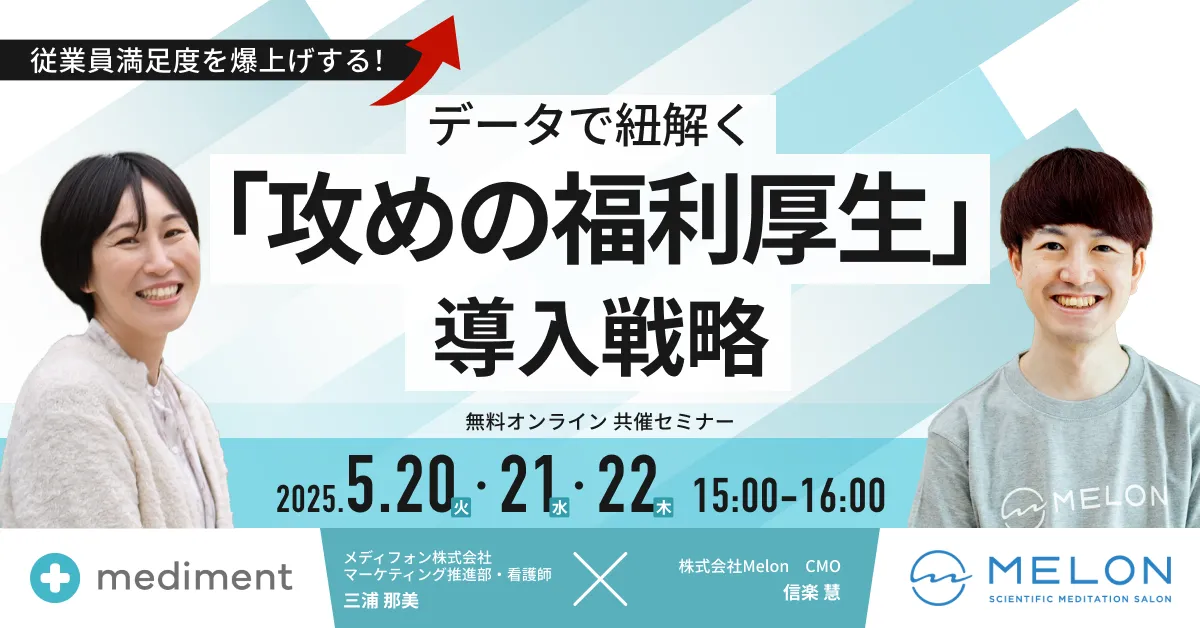 2025年5月20日から22日まで、株式会社Melonとメディフォンが共催するウェビナーが開催されます。テーマは「従業員満足度を爆上げする!データで紐解く『攻めの福利厚生』導入戦略」で、特に企業の人事労務や健康経営の担当者に向けた内容となっています。