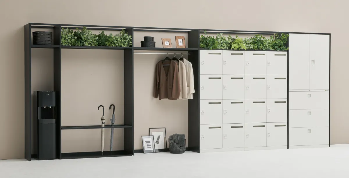 このシステムにより、異なる高さの収納やハンガー、傘立ても、調和の取れた納まりに整えられます。これにより、オフィス全体の印象が非常にスタイリッシュになり、社員が快適に使用できる環境が整うのです。