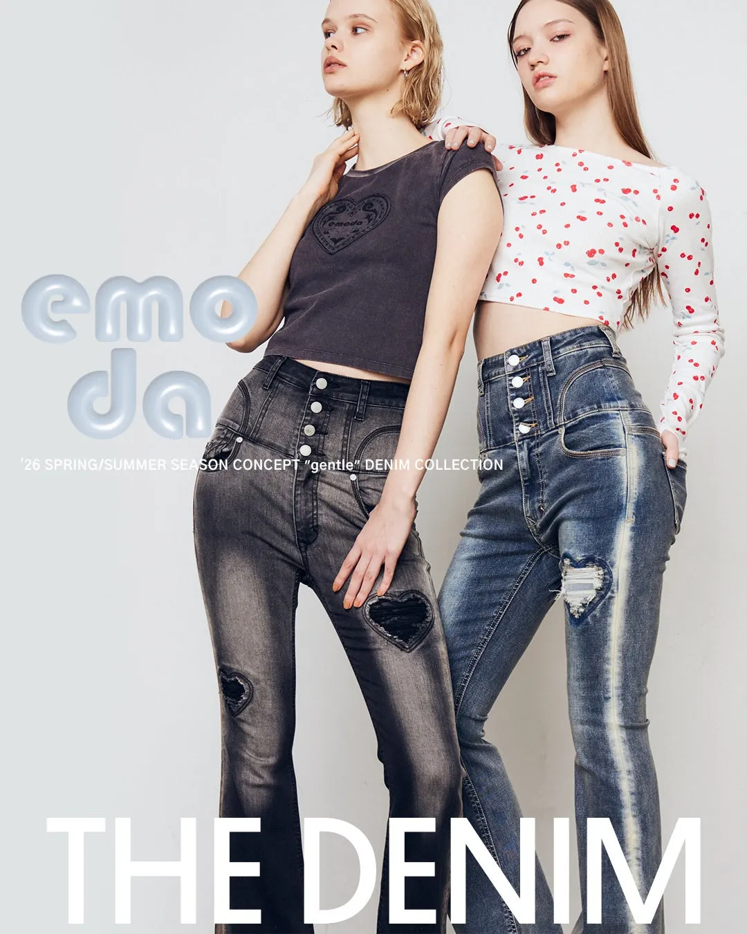 この「DENIM COLLECTION」は、EMODAの代名詞とも言える美脚デニムを中心に、デニムセットアップやデニムワンピースなど、さまざまなスタイルを展開しています。特に美脚ラインのデニムはEMODAならではのデザインで、特徴的なハートモチーフやチェック柄を取り入れたり、シンプルなシルエットでラインを強調したりすることで、より魅力的なシルエットを作り出しています。新作に込められたシーズンのテーマ「gentle」は、柔らかく優しい印象を与えつつ、どこかシャープさを感じるスタイルを演出しています。